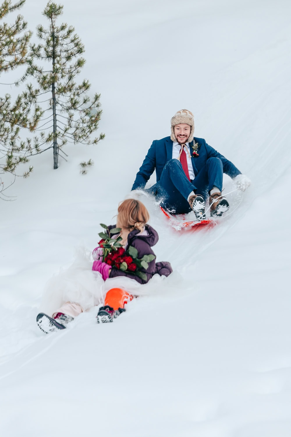 This stunning winter elopement in Colorado took a more unconventional route. The couple chose sledding – in their wedding attire! – as an activity for their incredibly fun and carefree elopement day.